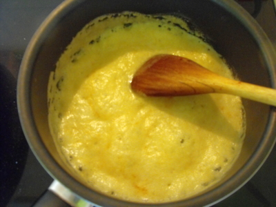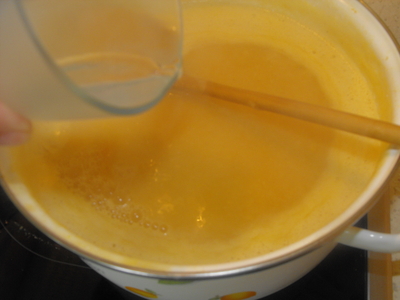 3) Opäť dáme variť a kým polievka zovrie, na masle si pripravíme zápražku z múky a červenej papriky. Vlejeme do polievky a pridáme vegetu.