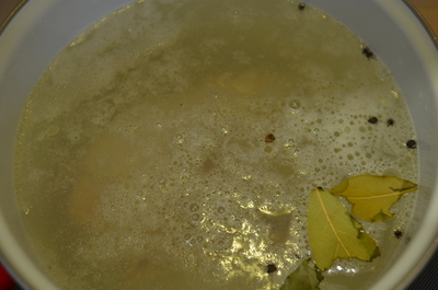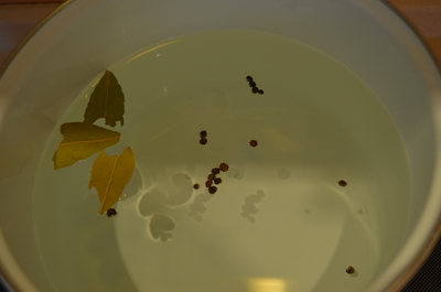 1) Do hrnca napustíme vodu, pridáme cca 1 čajovú lyžičku soli, čierne korenie, 2 bobkové listy a dáme zohriať.