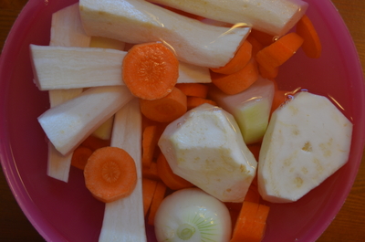 4) Keď už mäso vrelo 30 minút, pridáme do hrnca zeleninu a varíme ďalších 30 minút.