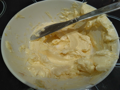 1) Pretlačený cesnak zmiešame so zmäknutým maslom, pridáme syr, papriku a soľ.