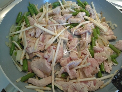 2) Na panvici so štipkou oleja orestujeme postupne plátky cibule, zeler, huby, fazuľky. Pridáme mäso a prudko restujeme asi 5 minút. Stále miešame a mäsko otáčame, aby neprihorelo a aby sa zavrelo zo všetkých strán.