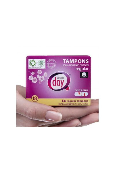 Tampóny Gentle Day® Regular, 18 ks v balení, sú vyrobené zo 100 % organickej bavlny, ktorá je šetrná k vašej pokožke ako aj k prírode.