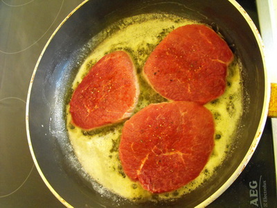 Na horúce roztopené maslo položíme steaky a pečieme 3 minúty