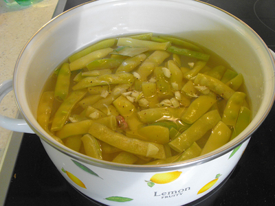 1) Očistené, pokrájané fazuľky dáme variť spolu s pokrájaným zemiakom, bobkovým listom a rozkrájaným alebo pretlačeným cesnakom.