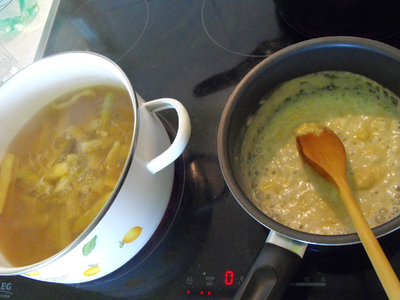 Privedieme do varu a v kastróliku si urobíme zásmažku z oleja a špaldovej múku.