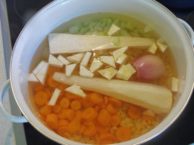 1) Sušený hrach si namočíme 2 hodiny pred varením v studenej vode. Potom vodu vylejeme a premyjeme hrach. Dáme variť so zeleninou pokrájanou na kúsky. Cibuľu a petržlen nekrájame. Posypeme mletým čiernym korením,osolíme a varíme, kým hrach nezmäkne /cca 1 hod/.
