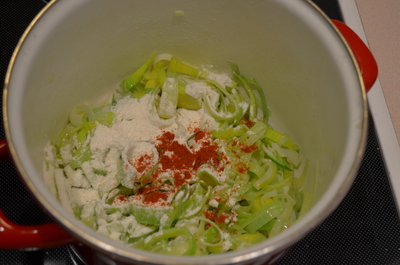 3) Orestovaný pór poprášime múkou, pridáme červenú papriku a poriadne premiešame.