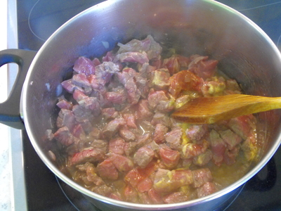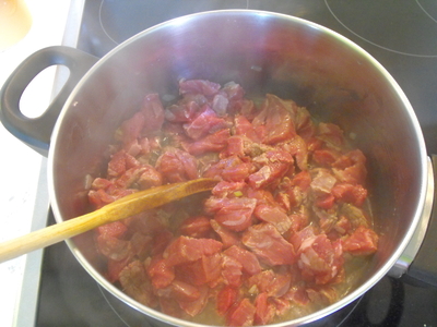 1) Mäso umyjeme, nakrájame na drobné kocky. Cibuľu ošúpeme a nakrájame nadrobno. V kastróli rozohrejeme olej a orestujeme cibuľu, pridáme mäso a premiešavame.