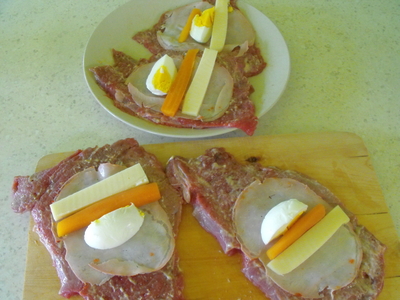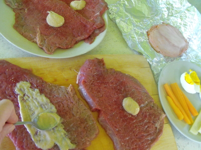 1) Uvaríme si vajíčko natvrdo a očistené mrkvy do polomäkka. Kvalitné vyššie hovädzie mäso umyjeme, osušíme a cez mikroténový sáčik naklepeme. Osolíme a okoreníme, potrieme z obidvoch strán horčicou.