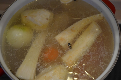 1) Do hrnca napustíme vodu, pridáme cca 1 čajovú lyžičku soli, čierne korenie, 2 bobkové listy a dáme zohriať.