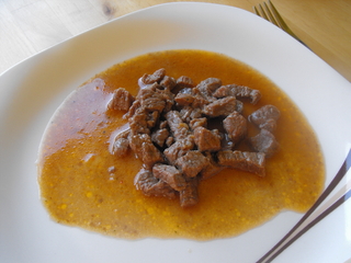 500g zadného hovädzieho 1 cibuľa /šalotka/ 1 polievková lyžica horčice 1 polievková lyžica kečupu mleté čierne korenie olej soľ...